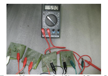 To determine the ability of using cactus (Opuntia) extract to generate electricity, pieces of cactus plate were squeezed to collect their extract in a dish. Then the prepared electrochemical cell, which was built by enveloping a Mg electrode with filter paper and Cu wire, was soaked in cactus extract for about two minutes to become saturated. The same procedure was carried out for another 5 cells. After that, all 6 cells were connected in series to measure the generated potential difference and current variations for a period of 6 hours.