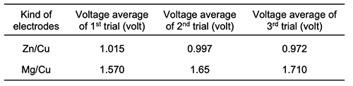 Table 5 shows that the potential difference average for the three trials was 6.76 V. By comparing the potential difference average of 4 cactus electrochemical cells with Mg/Cu electrodes with 8 cactus electrochemical cells with Zn/Cu electrodes, it was clear that the potential difference average for the 8 cells was more than the potential difference average of 4 cells by only 0.27 V despite duplicating the number of pieces.