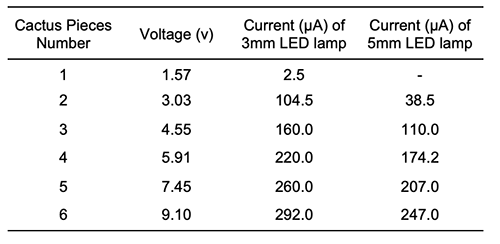 From the experiments which were carried out to determine how many pieces of cactus were needed to light 3 & 5 mm LED lamps, the results presented in Table 2 show that one piece was enough to light up the 3 mm LED lamp, whereas a minimum of two pieces of cactus were required to light up the 5 mm LED lamp. This difference refers to the LED lamp resistance which is increased with the increment of the lamp size. Beside that, the data showed that as the number of the cactus pieces increased, the voltage, the current and the LED lamp luminosity increased.