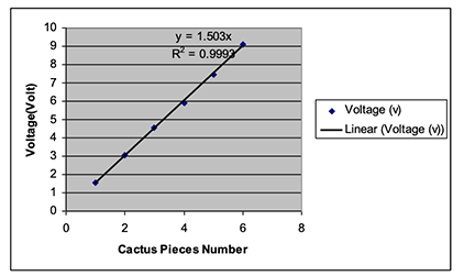 The result from Figure 3 shows that the R2 (Least Square Regression) fit is 0.9993, which indicates an excellent linear fit for the voltage versus number of cactus pieces. In addition, the data for the electrode set and the cactus electrolyte give a linear equation of: