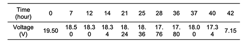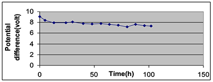 This test was carried out to examine the potential difference and current stability after 40 hours, as is mentioned in Table 5, and to determine the longest period to keep the LED lamp lighting with good luminosity. The results showed that the potential difference decreased from 9.10 V at the beginning of the experiment to 7.35 after 102 hours by a decrement percentage of approximately 16%.