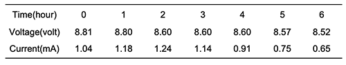 Table 6 shows the voltage and current variation for 6 cactus extract electrochemical cells connected in series.