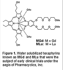 Both the coordination chemistry of texaphyrins and their electronic features were viewed as attractive in terms of potential technological development. In particular, they were found to form stable complexes with Lu(III) and Gd(III), both of which were characterized by lowest energy bands >700 nm in their respective UV-visible absorption spectra. The Lu(III) complex proved diamagnetic and a good singlet oxygen photosensitizer. In contrast, the Gd(III) complex was found to enhance so-called T1 relaxation effects. Perhaps not surprisingly, therefore, these two complexes attracted early interest as photodynamic therapy (PDT) [5,6] and magnetic resonance imaging (MRI) agents, respectively [7,8]. The further finding that the texaphyrins were 1) relatively easy to reduce and then 2) readily re-oxidized by oxygen to 3) produce reactive oxygen species made them of interest as potential radiation sensitizers [9-13].