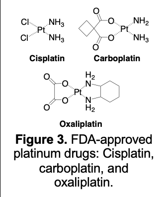 Currently, three Pt(II) complexes have been approved as cancer chemotherapeutics by the US FDA, namely cisplatin, carboplatin, and oxaliplatin (Figure 3). Together, these three agents remain part of the treatment regimen for roughly 50% of patients receiving cancer chemotherapy worldwide. Sadly, however, in many cases the administered platinum drugs are not curative. The FDA platinum drugs are noted for their lack of cancer targeting (thought responsible in part for systemic toxicity effects), as well as poor uptake/retention into cancer cells. These problems are exacerbated in the case of platinum resistance.