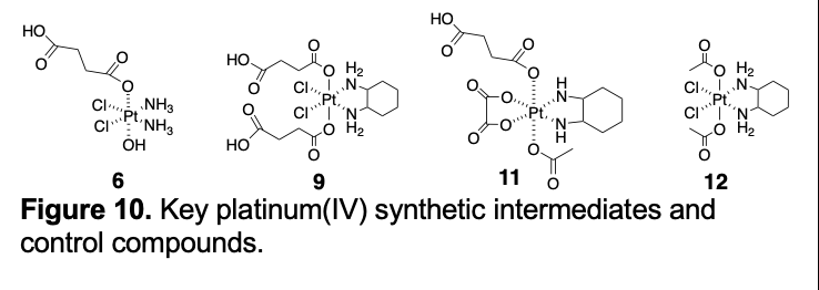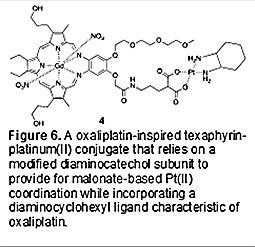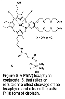 In this conjugate, the Pt(IV) center was designed to serve as a prodrug form of cisplatin. The critical design element is the axial carboxylate anion that serves to link the Pt(IV) center to the texaphyrin core. The requisite carboxylate species was put in place synthetically by coupling the succinyl functionalized Pt(IV) derivative, 6 (Figure 10), with the amine functionalized texaphryn 7.