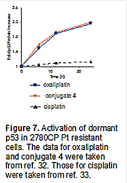 In accord with our design expectations, conjugate 4 was found to induce expression of p53 and its functional activation in both the A2780 and 2780CP cell lines, as evidenced by Western blotting and monitoring of the transcriptional activation of p21 as a downstream target of p53. Conjugate 4 was thus found to mirror the behavior seen for oxaliplatin, but not cisplatin, a platinum drug that is unable to induce p53 induction in the case of the resistant 2780CP cell line (Figure 7).