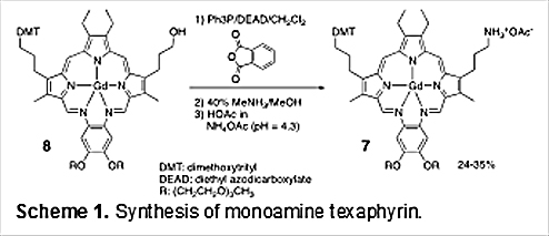 This key texaphyrin monoamine was prepared by subjecting MGd to mono-protection (to give 8), followed by Mitsunobu amination, as originally detailed by Magda and collaborators in 2004 (cf. Scheme 1) [20].