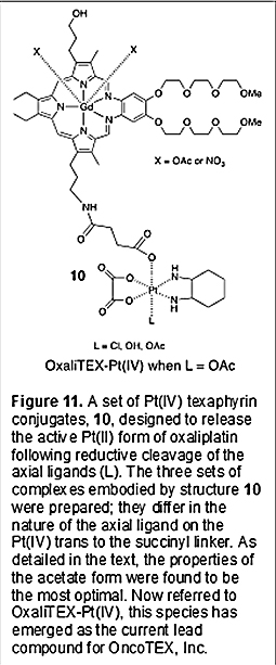 In collaboration first with Dr. Darren Magda and other researchers then at Pharmacyclics, Inc., and subsequently with Dr. Siddik, a program was thus launched to create and test platinum-texaphyrin conjugates. This effort can be divided into three phases, namely early exploratory efforts, preparation of first generation systems, and development of second generation systems. As detailed below, this body of work has culminated in the selection of OxaliTEX-Pt(IV) as OncoTEX's initial drug lead.
