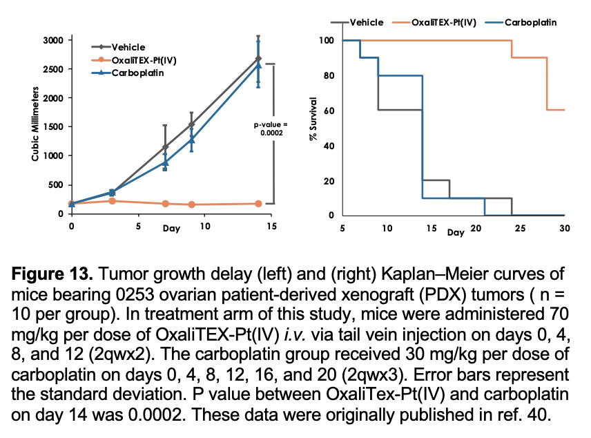 To assess whether OxaliTEX-Pt(IV) might have a role to play in treating tumors that are characterized by poor responses to traditional platinum agents, further efficacy studies in patient-derived xenografts (PDXs), including the 0253 ovarian cancer xenograft (provided by Champions Oncology), were carried out. Mice bearing 0253 ovarian PDX tumors did not respond to treatment with carboplatin (the current standard of care platinum drug for this disease) when administered at a dose level near its MTD. In contrast, treatment with OxaliTEX-Pt(IV), again at a dose close to the MTD, resulted in 95% tumor growth inhibition at the end of the study (Figure 13, left). This delay also translated to a statistically significant increase in survival (Figure 13, right).