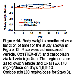 Promising results were also found in related studies involving the 0069 colorectal PDX model. In neither case was appreciable weight loss seen during the course of the studies (cf., e.g., Figure 14). This latter finding was taken as evidence that, at the near-MTD doses administered, OxaliTEX-Pt(IV) was well tolerated.