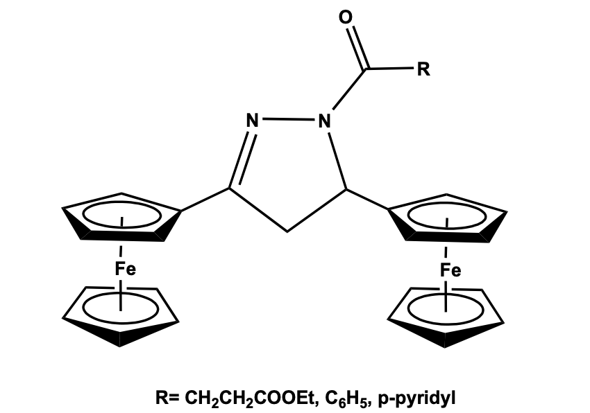 A variety of di-ferrocenyl compounds have been synthesized in the last decade and their different properties were studied. In recent years, several di-ferrocenyl molecules with conjugated as well as non-conjugated bridging chains have been synthesized to understand their electronic coupling between the redox-active units. In addition to the linearly conjugated bridging ligands between the ferrocenyl moieties, cross-conjugated type bridging ligands are also explored [5-14]. The binuclear and poly-nuclear mixed-valence metal complexes with p conjugated bridging ligand have attracted continuous interest for decades, which led to the study of electron transfer processes. Yuan et al. have reported three dihydro pyrazole bridged ferrocenyl systems by the reaction of diferrocenyl chalcone with hydrazine hydrate followed by acylation with acyl chloride. The diferrocenyl pyrazole derivatives have been structurally characterized by single-crystal X-ray diffraction study which shows that the two ferrocenyl fragments are pointed at two different planes and connected to pyrazole ring carbon atoms. The bond distance between the Cp ring of ferrocene and the Pyrazole group is considerably shorter than the normal C-C bond which confirms distinct conjugation between the ferrocenyl and pyrazole ring (Figure 1) [15].