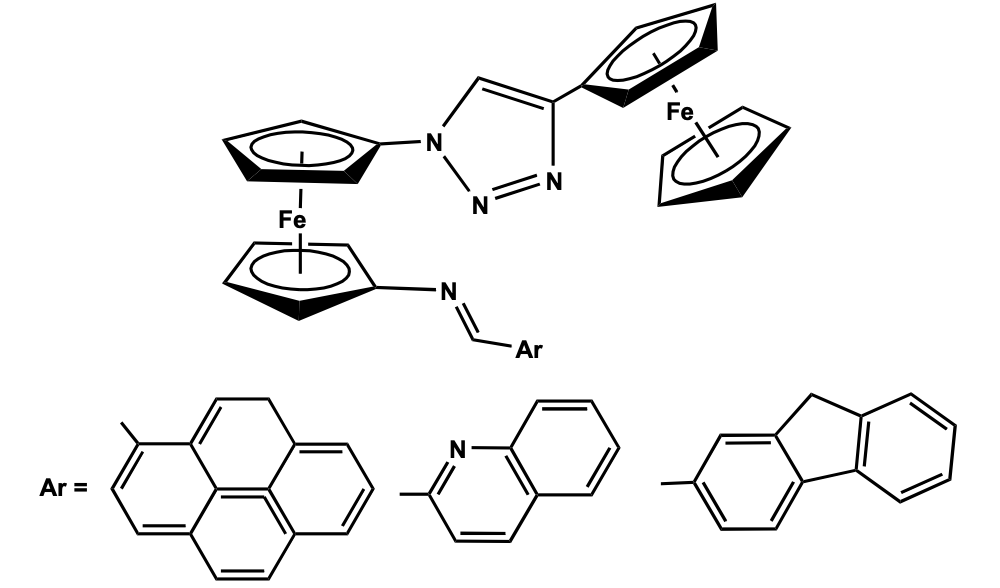 Recently, a research group of Molina has designed a novel synthetic strategy for the preparation of 1,1’- ferrocenyl triazole compound from ferrocene by a series of reactions involving lithiation, click reaction, and Staudinger reaction with trimethyl phosphine to give an iminophosphorane derivative which further undergoes Aza-Witting type of coupling reaction with various aldehydes to give the diferrocenyl triazole derivatives, 1,1’-[Ar-CH=N(h5-C5H4)Fe{(h5-C5H4)(NN=NC=CH)(h5-C5H4)Fe(h5-C5H5)], {Ar= pyrene, quinoline,fluorene} (Figure 2) [16].