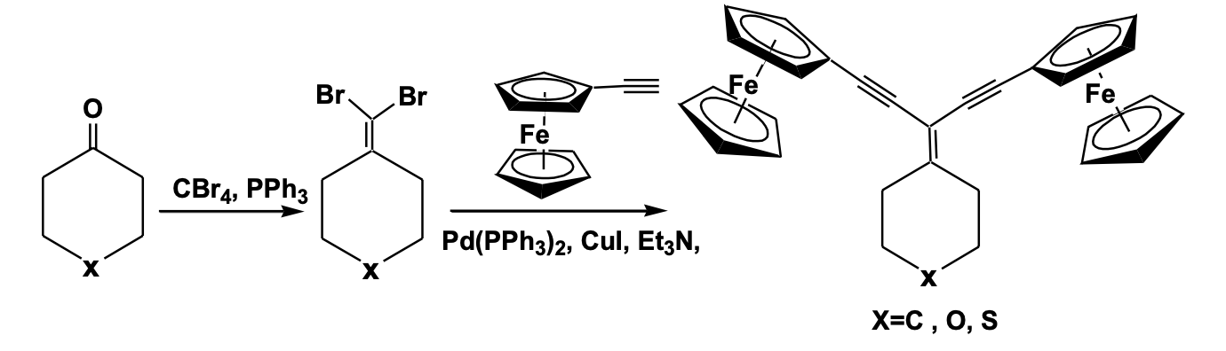 Three geminal-diethynylethene bridged di-ferrocenyl compounds have been recently reported using the Corey-Fuchs olefination process of a keto compound to give a dibromo olefin intermediate, which under Sonogashira condition gave the geminal-diethynylethene bridged di-ferrocenyl system. The structural characterization shows a typical planar Y-shaped geometry of the gem-diethynylethene backbone with the formation of a chair-like conformation of the cyclohexane or thiopyran pendant substituent. The non-bonded Fe...Fe distance between the two ferrocenyl units is in the range 6.76 -9.17 Å, depending upon the bridging substituent. Although two ferro-cenyl units are equivalent, the cyclic volt-ammetric and IVCT study showed a pair of redox couples indicating strong electronic communication between the two redox centers and the presence of a class II mixed valence system within the molecular framework (Scheme 1 ) [21].