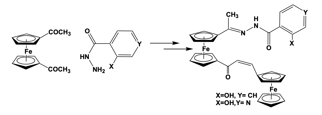 Chatterjee et al. has reported some ferrocene and diferrocene based hydrazone derivatives that can selectively sense Pb2+metal cation. A diferrocenyl based hydrazone–enone compound has shown effective sensing properties. The compound has been synthesized using a two-step reaction method ; the first step being the reaction of 1,1’-diacetyl ferrocene with respective hydrazide to produces the corresponding ferrocenyl hydrazone derivative, which was used for the reaction with monoaldehyde ferrocene in a basic condition to give the diferrocenyl hydrazone-enone derivatives (Scheme 2).