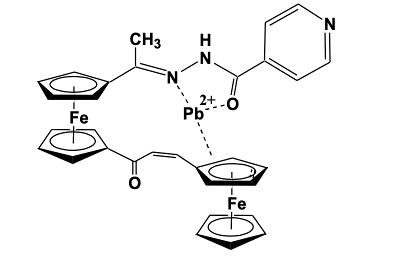 The structures have been confirmed using a single- crystal X- ray diffraction study which shows the presence of two non-equivalent ferrocenyl units oriented opposite to each other and connected to hydrazone and enone moieties. The hydrazone and enone chain in the molecule are oriented in eclipsed conformation. The cyclic voltammetry study shows two reversible one-electron redox waves confirming the presence of two chemically non-equivalent ferrocenyl units. The UV-Visible binding study shows that the compound selectively interacts with the Pb2+ ion with a marked displacement of the spectral bands while other cations show no significant change in their spectral property. Theoretical calculation predicted the site of Pb2+ interaction mainly through the ketonic oxygen, imine nitrogen, and cyclopen-tadienyl ring of the molecular system as shown in Figure 4 [22].