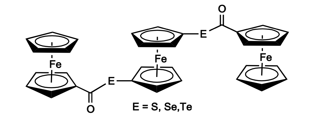 Different types of tri-ferrocenyl systems have been prepared with “star-shaped”, linear, cyclic architecture and their interactions were studied mainly to understand their mixed-valence capacity. The interaction among the ferrocenyl systems occurs through various bridging groups and depends upon the extent of conjugation, chain length, etc. The synthesis and characterization of homoleptic tri(ferrocenyl) “star-shaped” derivatives, with heteroatoms like B, N, P, S, Se, Sb, Bi, has been described by Togni and Hayashi which shows a range of multi-ferrocenyl derivatives with bridging main group atoms [24]. Some early report shows that a tri-ferrocenyl compound with a bridging E-C(O), (E = S, Se, Te) unit was synthesized from lithiated ferrocenyl chalcogenols with ferrocenyl acyl chloride (Figure 6).