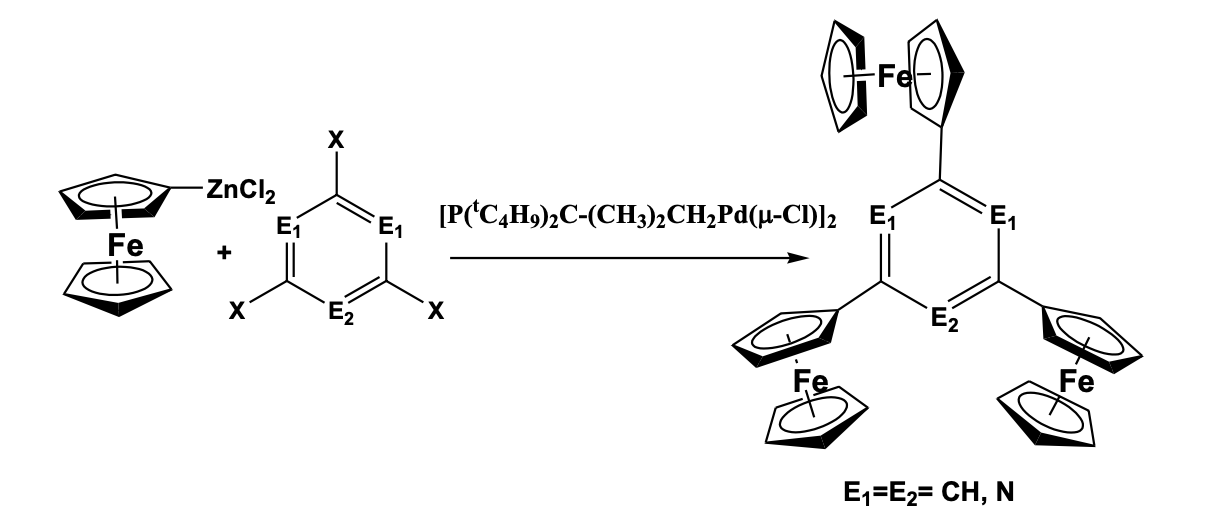 Lang et al. have reported the synthesis of “star-shaped” tri-ferrocenyl based six-membered aromatic ring including benzene, pyridine, and triazine (Scheme 3).