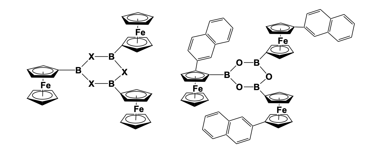 Appel et al. [32] and Thilagar et al. [33] have separately synthesized redox-active boraxine compounds and established their electronic communication within the redox-active groups (Figure 8).
