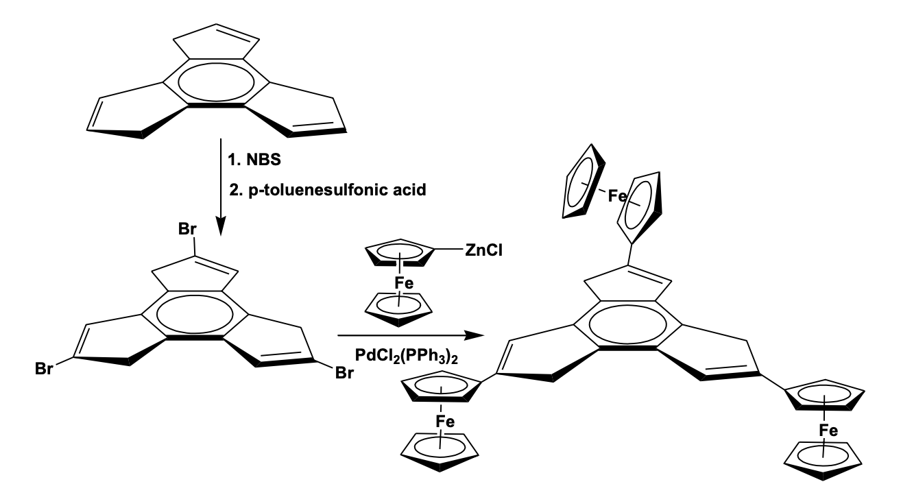 Synthesis of a tri-ferrocenyl complex of dihydro-1H-trindene has been carried out by a two-step process involving the conversion of dihydro-1H-trindene to bromohydrins by the reaction with N-bromosuccinimide to give tribromo-1H-trindene, which gave the tri-ferrocenyl derivative by Negishi cross-coupling with ferrocenylzinc chloride in presence of PdCl2(PPh3)2 catalyst (Scheme 4).