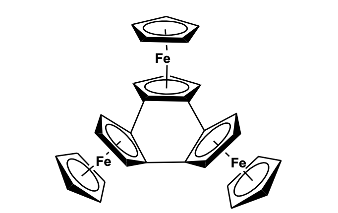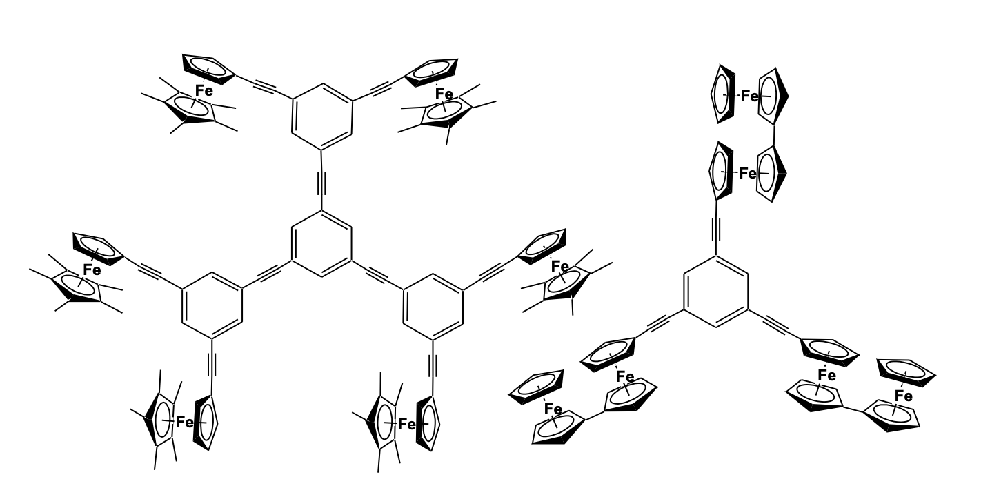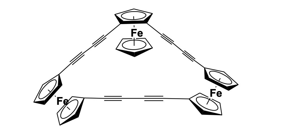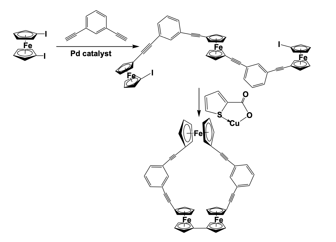 Sonogashira cross- coupling of 1,1’-Diiodoferrocene and 1,3-diethynylbenzene in the presence of Pd(PtBu3)2 catalyst gave a tri-ferrocenyl molecule which was cyclized using a copper-mediated Ullmann-like coup-ling reaction to give a cyclic ferrocenyl structure with alkyne bridging.