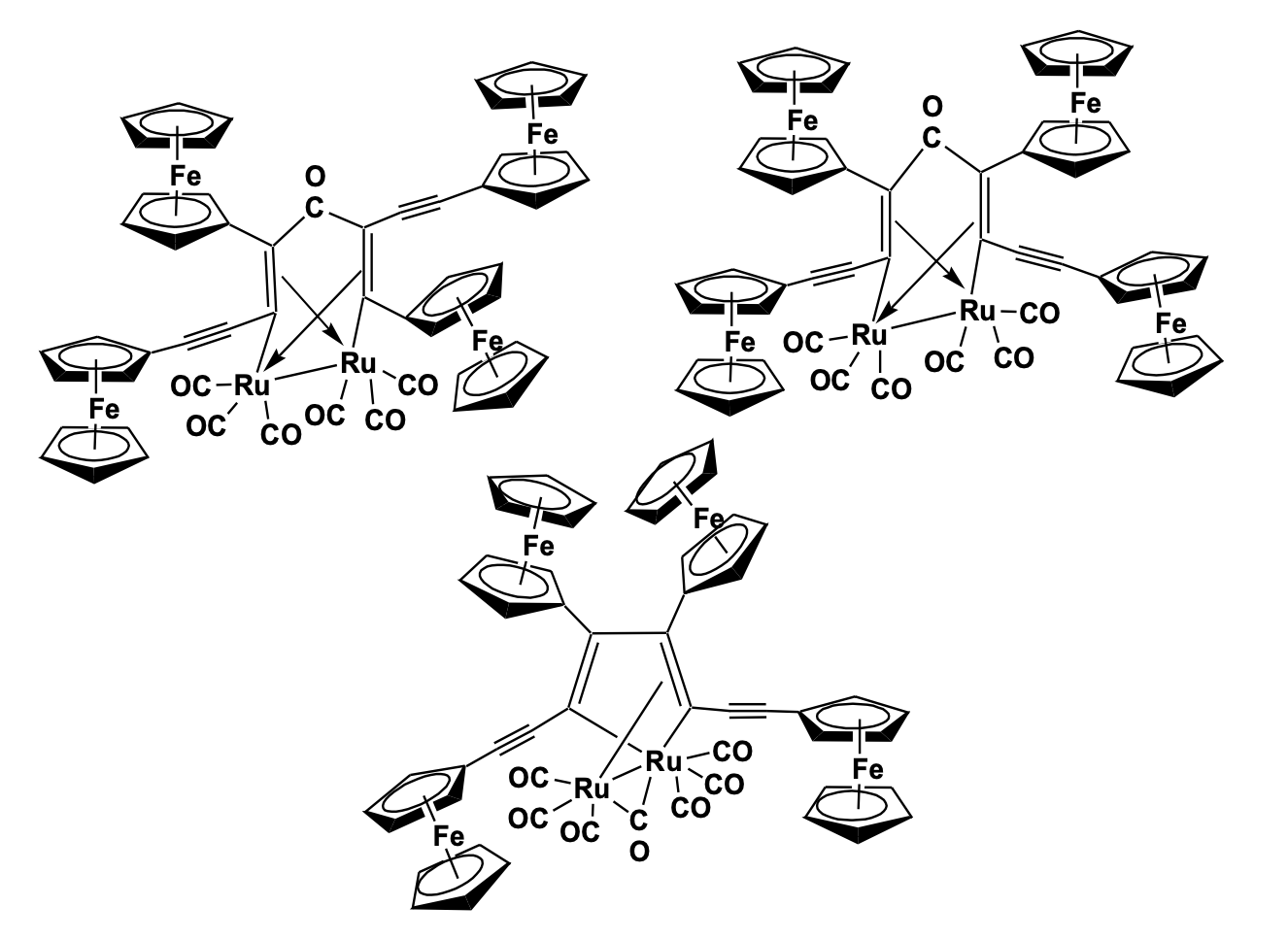 Reactions of metal clusters with polyenes have attracted significant interest for the synthesis of extended carbon chains with wide coordination modes. In this reaction, a similar technique has been used to make multi-ferrocenyl linkages which are an attractive candidate for the study of electronic communication and mixed-valence species. The structure of the three tetra-ferrocenyl metalacyclic compounds has been evaluated by single-crystal X-ray crystallography which shows three different cyclic bridges with and without the carbonyl incorporation. The ferrocenyl entities are randomly oriented to release the steric strain across the molecule due to the presence of the bulky -C≡C-CFc group [38].
