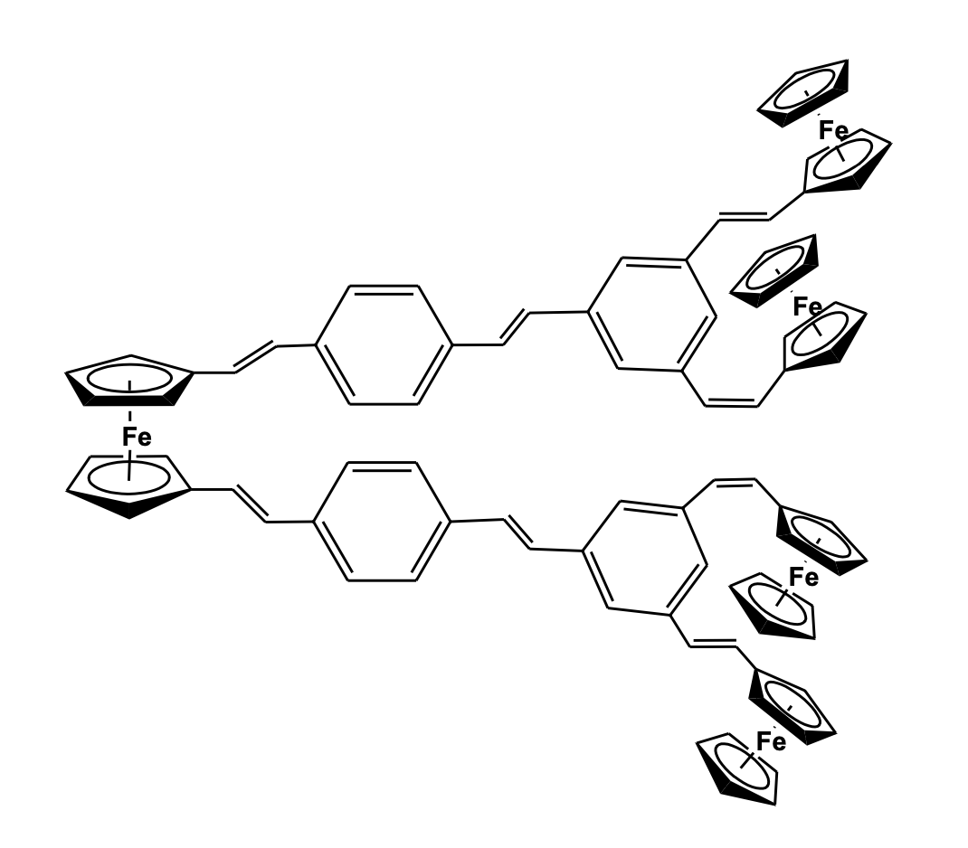 Electron transfer mechanisms in multi-redox systems like polymers, dendrimers, and macrocyclic moieties are of prime importance due to their relevance with biologically inspired electron transfer and redox processes. Also, these systems have been of interest for their potential as mixed-valence species, redox recognition, and catalysis. Ferrocenyl entities have always been a good choice to act as redox species due to their reversible process and stability of the mixed valence systems. Recently, the research group of Astruc has reported the synthesis of a series of rigid hexa- and dodeca- ferrocenyl arene centered poly(ethy-nylphenylene) dendrimers with C3 sym-metry using Sonogashira type coupling reaction and studied their electron-transfer properties. The polyferrocenyl entities showed distinct communication and stabilization of the mixed valence species (Figure 18) [52,53].
