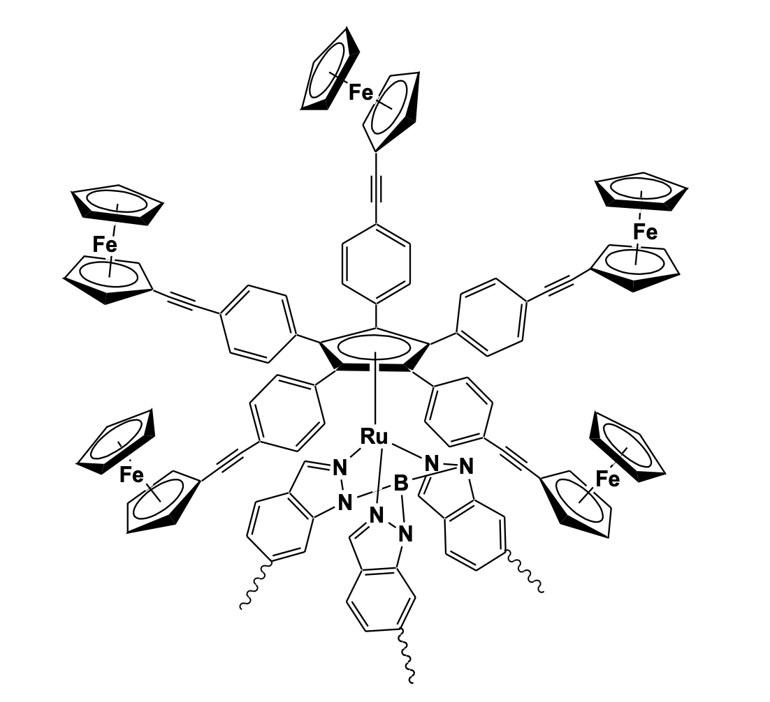 In a remarkable use of a multi-ferrocenyl system in miniaturized molecular devices, Rapenne and Launay reported the concept of an electrically fuel ed single molecular rotary motor based on the transport of electrons between two electrodes by the electroactive groups attached to a central rotatable core. The motor is based on a ruthenium complex with a piano stool geometry bearing two different ligands that act as a rotor and a stator. The stator is a tripodal hydrotris(indazolyl)borate ligand functionalized by ester groups while the rotor is a cyclopentadienyl (Cp) ligand connected to five ferrocenyl groups by linear and rigid arms (Figure 16) [50].