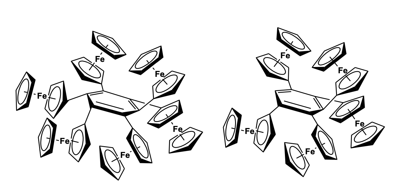 The single-crystal structural analysis of the hexa-ferrocenyl benzene revealed that the central benzene ring is not planer and adopts a chair conformation. The cyclic voltam-metric study showed three well-separated reversible 1e, 2e, and 3e redox couples sug-gesting effective electronic communication (Figure 17) [51].