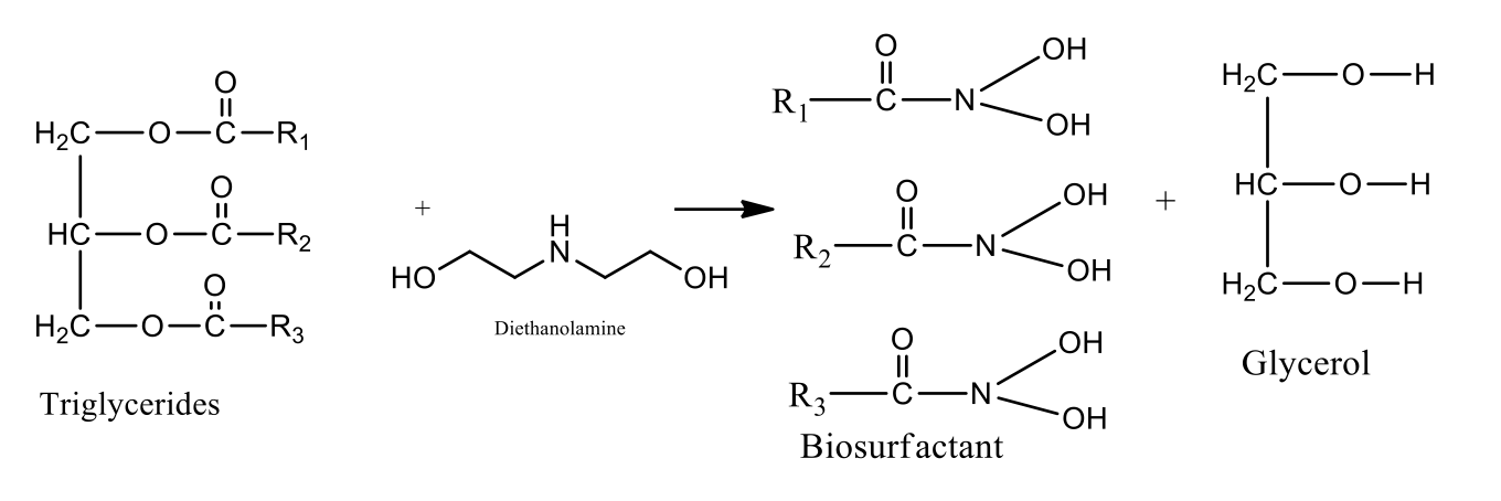 This was carried out following the method of Adewuyiet al. [15]. The reaction was carried out in a round bottom Pyrex glass. The reaction flask was equipped with a mechanical stirrer, thermometer and condenser. Esterified sponge seed oil and diethanolamine were reacted at a molar ratio of 1:6 in the presence of sodium methoxide as a catalyst (2% by weight of diethanolamine and oil). The reaction was carried out at a temperature of 115°C, while the formation of diethanolamine was monitored with TLC. At the end of the reaction, the mixture was allowed to cool and later dissolved in diethyl ether to recover the biosurfactant, and separation was performed using a separating funnel. The ether phase was washed with water and passed over sodium sulfate. The resulting ether fraction was later concentrated using a rotary evaporator. The scheme of the reaction is shown in Scheme 1.