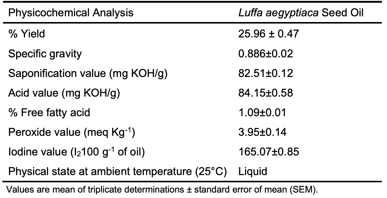 The physical and chemical properties of the sponge seed make it viable for use as an industrial source of fat and oil due to its high yield of 25.96 ± 0.47%. The low free fatty acid content may be accounted for by the low peroxide value of 3.95±0.14 meq kg-1, which indicates the presence of natural phytochemicals present in the oil preventing the oxidation and hydrolysis of the oil and hence the low free fatty acids. The low free fatty acids also show that the oil is of high quality and has a long shelf-life. The high iodine value of 165.07±0.85 I2100 g-1 of oil exhibited by the seed oil accounts for why the oil is liquid at room temperature. The oil is largely made of unsaturated fatty acids with a total degree of unsaturation of 70.23%, as obtained from GC-MS analysis.