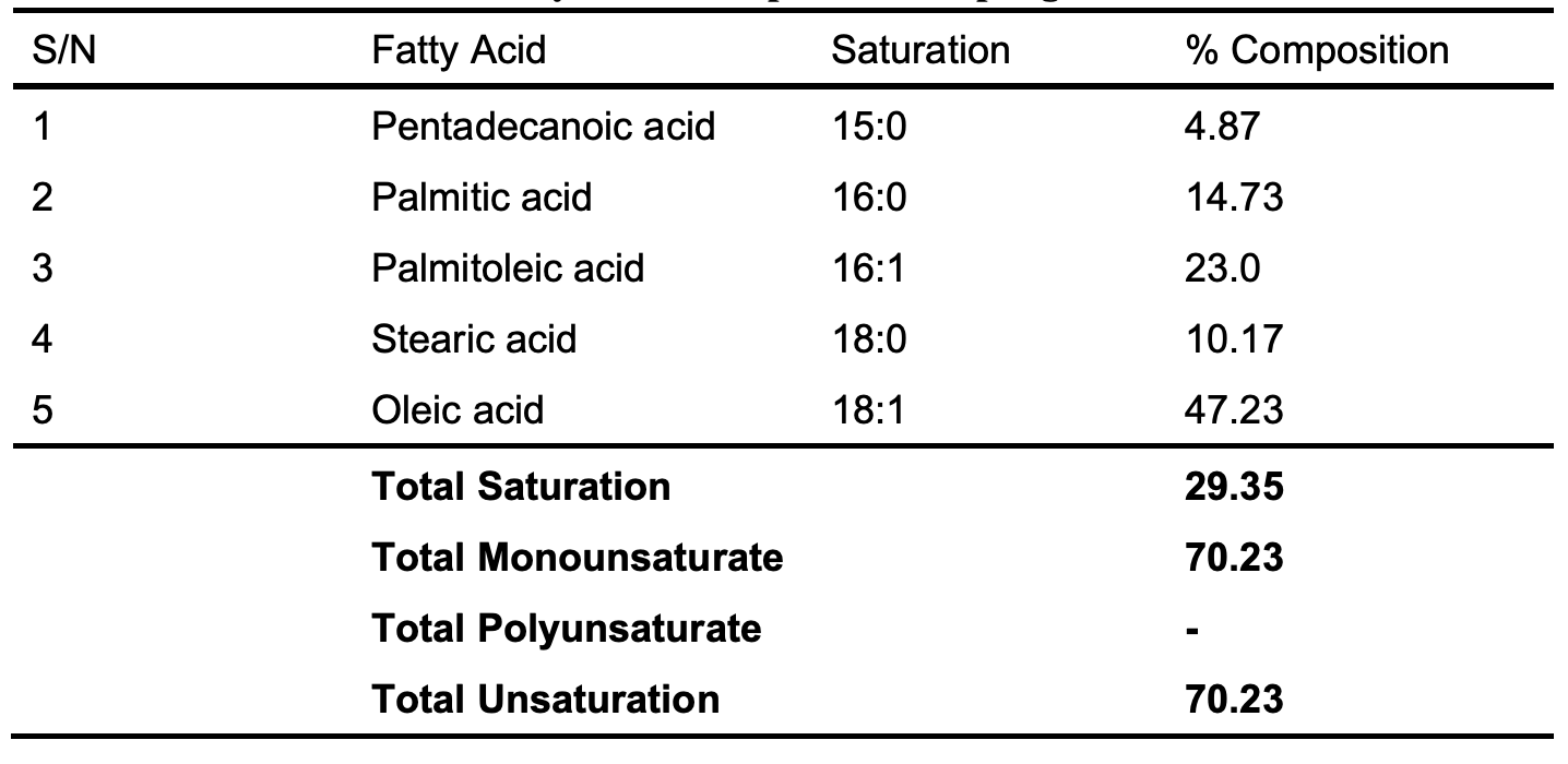 The fatty acid composition of the oil obtained from GC-MS is shown in Table 2. The most abundant fatty acids are oleic acid, a monounsaturated fatty acid that accounts for 47.23% of the total oil, followed by palmitoleic acid, another monounsaturated fatty acid that accounts for 23.0%, and stearic and palmitic acid, which both accounts for 10.17 and 14.73 degrees, respectively. The oil is largely made of unsaturated fatty acids.