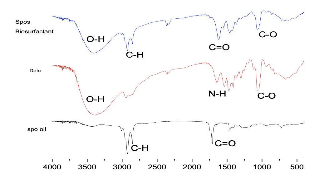 The FT-IR spectra of sponge seed oil, biosurfactant and diethanolamine (super-imposed) are shown in Figure 1 below.