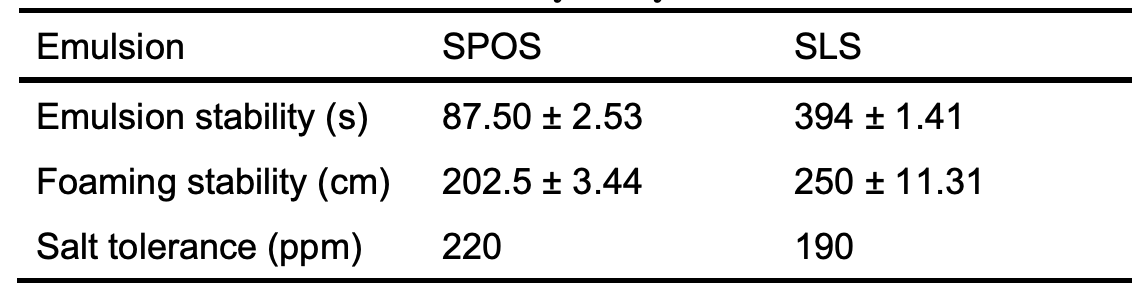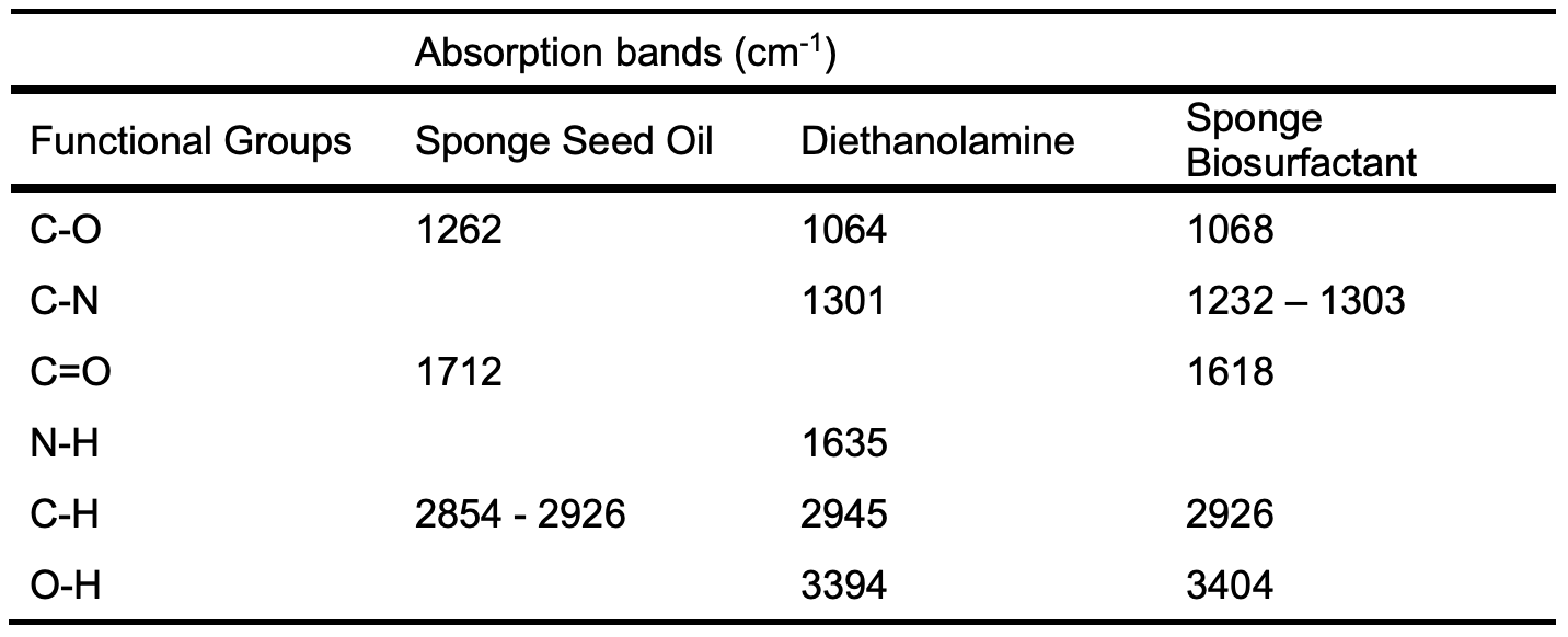 The clear absence of a hydroxyl group (O-H) in the seed oil and carbonyl group (C=O) in diethanolamine, which were prominent in the biosurfactant at 1618.33 cm-1, indicate the formation of a biosurfactant. The prepared biosurfactant shows a lower emulsion stability of 87.50 ± 2.53 seconds to 394 ± 1.41 seconds but better foaming stability, comparable to SLS used as a control.