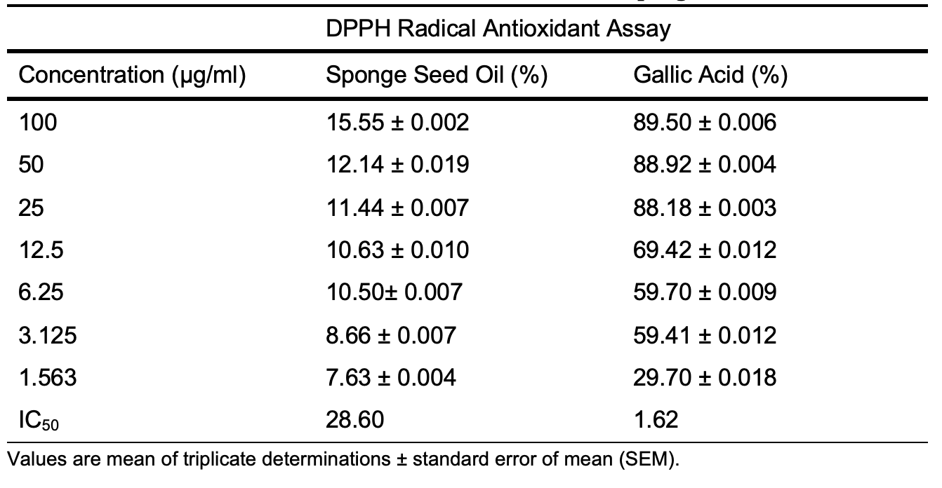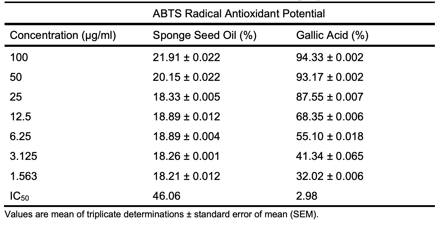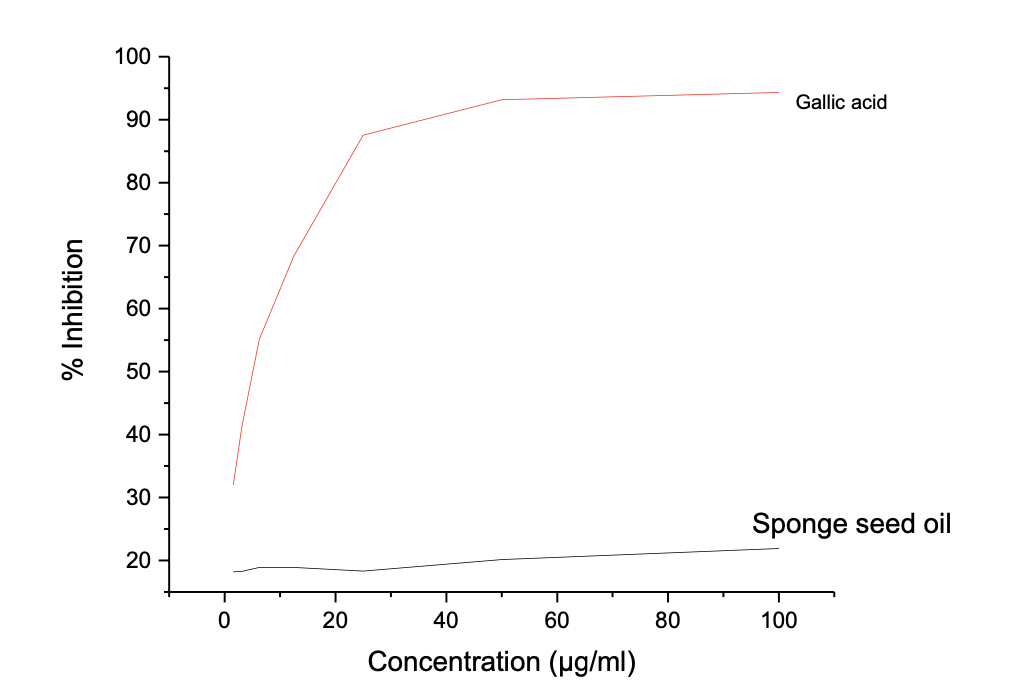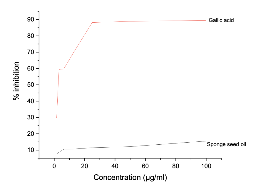 The results showed a concentration-dependent antioxidant potential, and the highest inhibition potential was recorded at 100 µg/mL for both the oil and gallic acid, where the oil showed a maximum inhibition potential of 21.91 ± 0.022 compared to 94.33 ± 0.002 for gallic acid against ABTS radicals. The seed oil shows a far higher IC50 value of 46.06 µg/mL compared to 2.98 µg/mL, indicating that gallic acid has superior ABTS radical scavenging antioxidant potential than Luffa aegyptiaca.