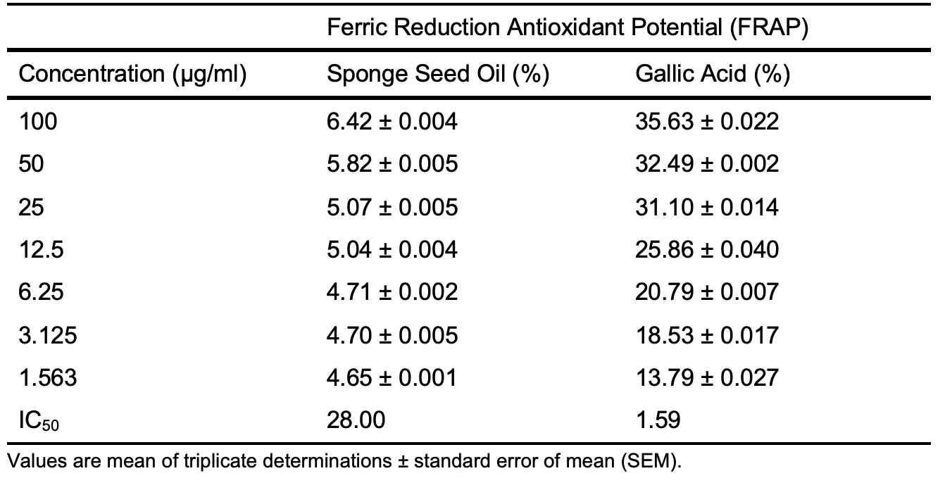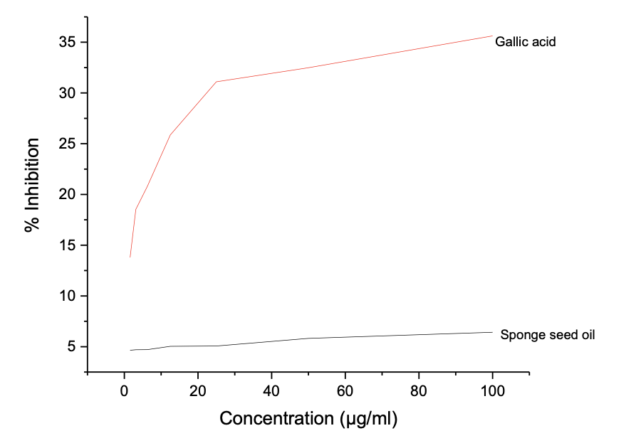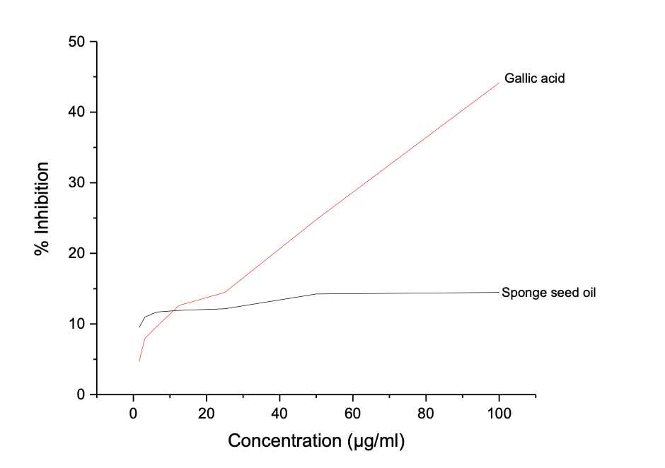 Table 5c shows the results of the ferric reduction antioxidant potential (FRAP) of Luffa aegyptiaca seed oil across a con-centration range of 100 to 1.563 µg/ml. The seed oil shows the highest inhibition of 6.42 ± 0.004 compared to 35.63 ± 0.022% for gallic acid. The better antioxidant activity of gallic acid over the seed oil was further con-firmed from the IC50 value calculated from Figure 2c, which shows IC50 values of 28.00 and 1.59 µg/ml for seed oil and gallic acid, respectively.
