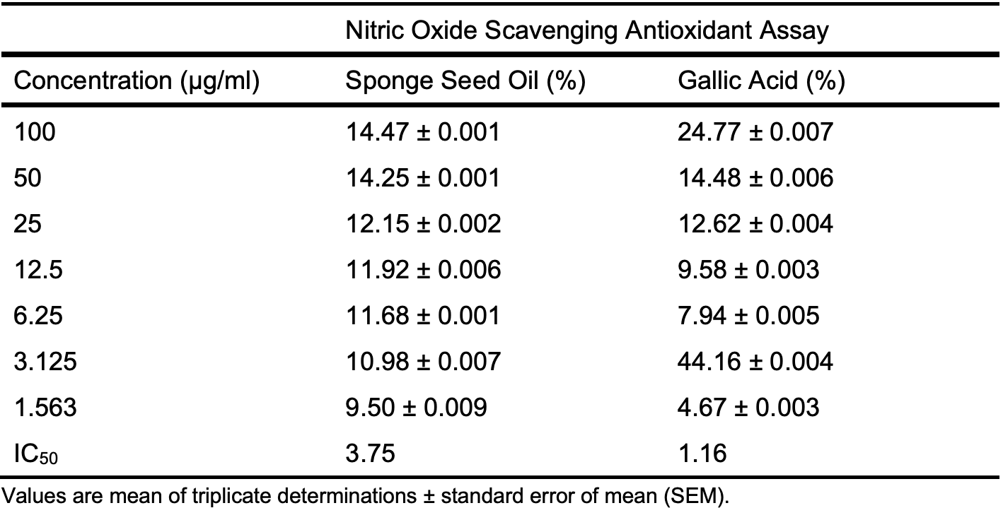 The low IC50 value of 3.75 µg/ml by the seed oil is comparable to that of gallic acid (1.16 µg/ml), indicating the huge potential of the seed oil to inhibit nitric oxide-induced oxidation of corrosion inhibition materials.