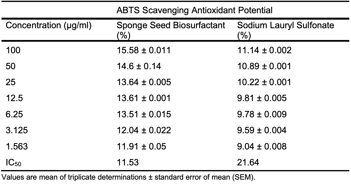 The 2,2′-Azinobis-(3-Ethylbenzthiazolin-6-Sulfonic Acid (ABTS) antioxidant potential of seed oil, biosurfactant and sodium lauryl sulfonate (SLS) surfactant used as a control was established by reacting 2 mL of various concentrations 50, 25, 12.5, 6.25, 3.125, 1.562, 0.781, and 0.391 µg/ml of the samples with 2 mL ABTS cation solution following a standard assay procedure by mixing freshly prepared ABTS+ standard solution (7 mM). with potassium persulfate (2.45 mM). The resultant mixture was kept in the dark for 12 hours at room temperature, after which it was further diluted with methanol to achieve an optical density of 0.7 ± 0.01 when measured on a UV spectrophotometer at 734 nm. The ABTS solution will be allowed to react for 60 sec with various concentrations of the oil, biosurfactant and control surfactant, and the optical density will be read at the same wavenumber. Garlic acid was used as a standard control, and the experiment was carried out in triplicate [18].