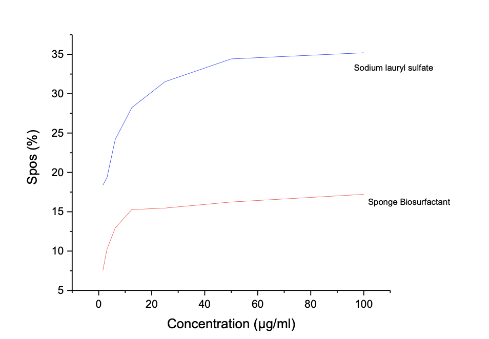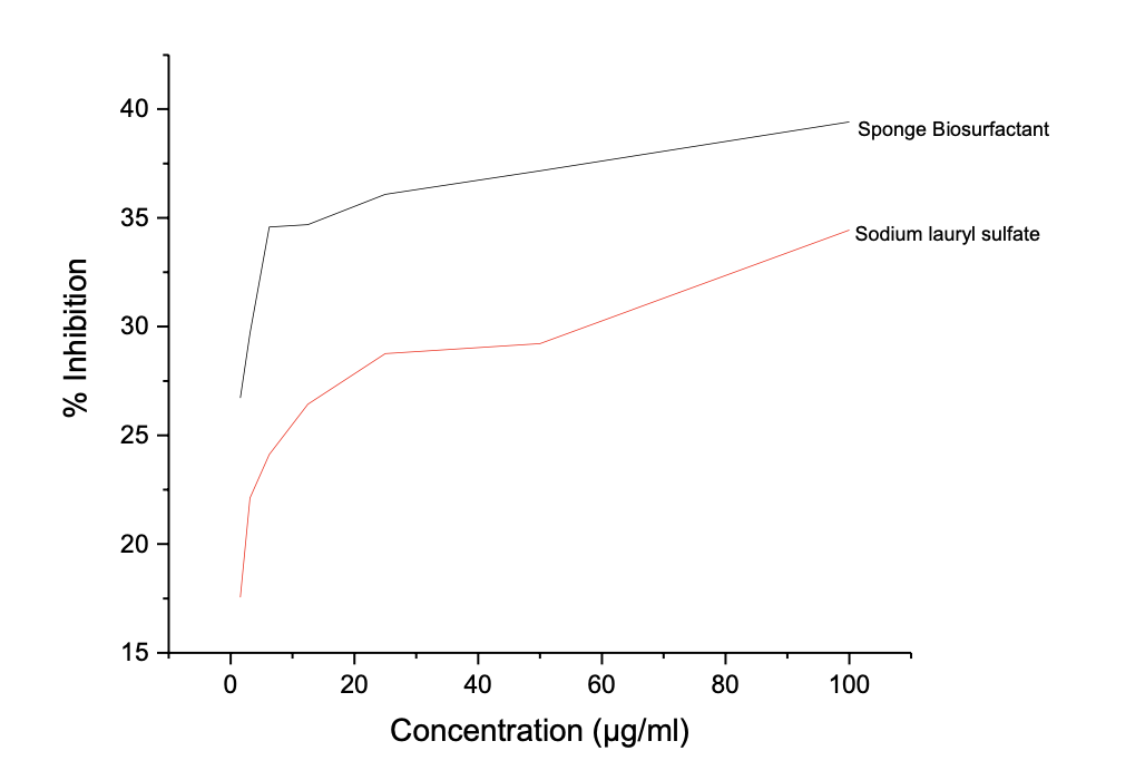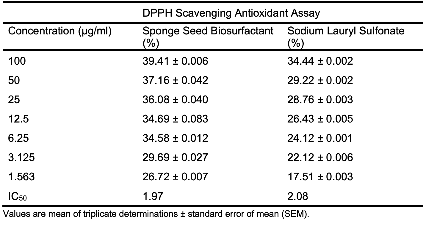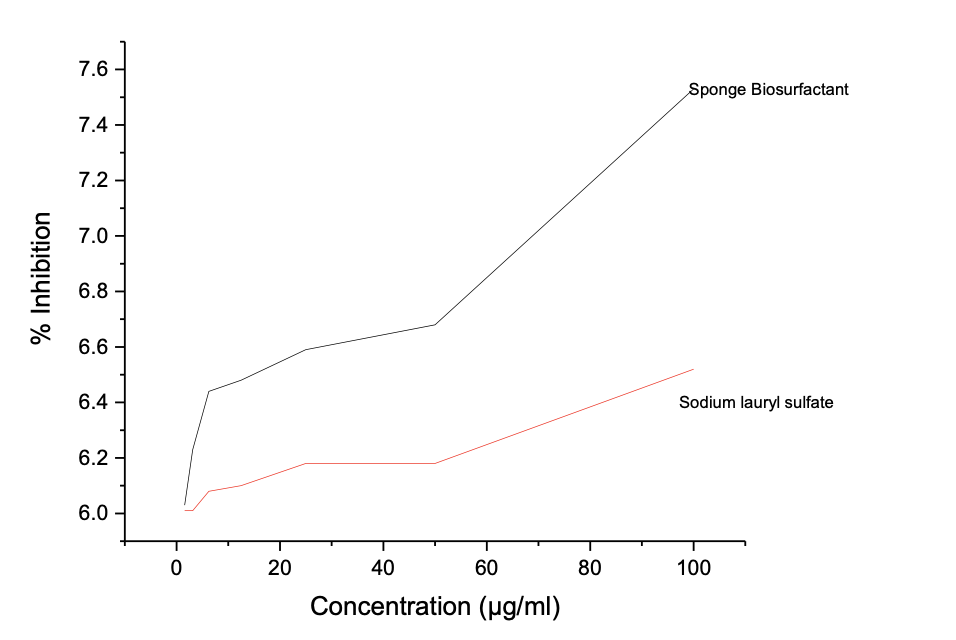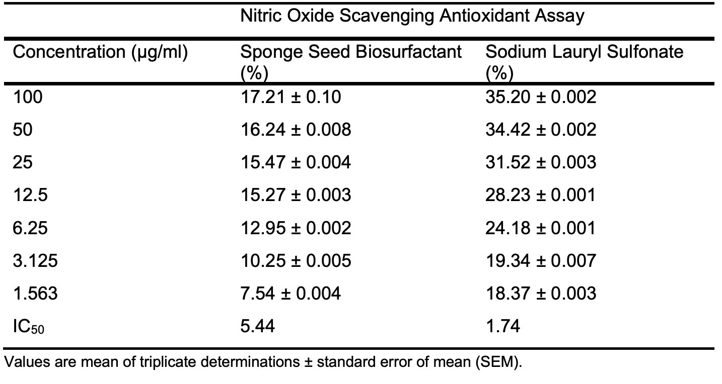 However, SLS shows better nitric oxide antioxidant assay than the prepared biosurfactant with IC50 value of 1.74 to 5.44 µg/ml in Table 6d and Figure 3d. The antioxidant activities shown by sponge seed oil biosurfactants are comparable to reported values by Rinaldiet al. [23] for neem oil biosurfactants.