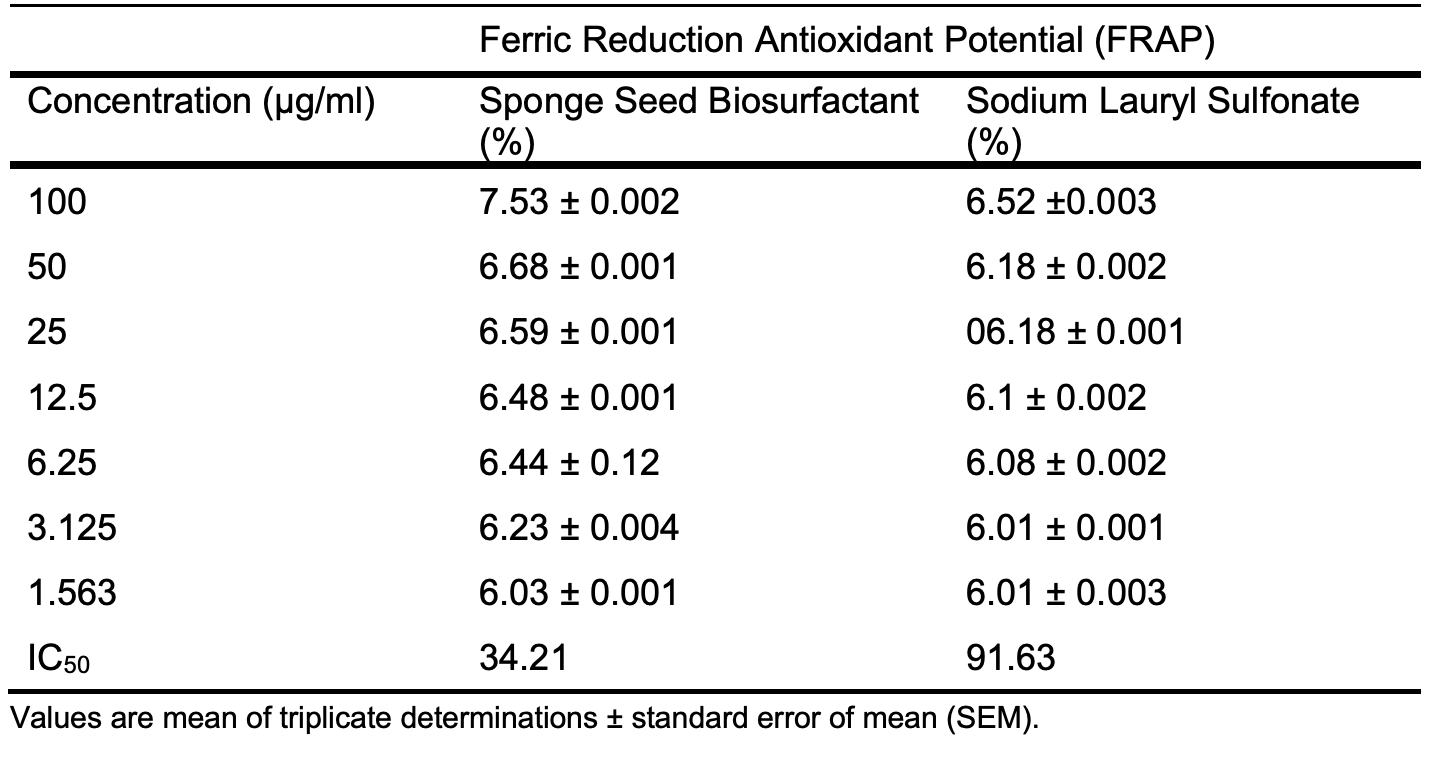 The biosurfactant shows a consistent sup-erior antioxidant potential over SLS, a synthetic antioxidant across Tables 6b – 6c and Figures 3b – 3c, with lower IC50 values for the biosurfactant to that of SLS, 1.97 to 2.08 µg/ml for DPPH radical antioxidant assay, 34.21 to 91.63 µg/ml for FRAP assay, respectively.