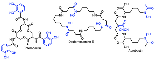 Many bacteria when stressed for iron produce siderophores – low molecular weight natural products that bind Fe(III) with high affinity. Siderophores can solubilize colloidal iron oxides or in some cases remove Fe(III) bound in proteins, and by so doing facilitate microbial uptake of the Fe(III)-siderophore complex. Siderophores are distinguished by the key functional groups that coordinate Fe(III), including catechols, hydroxamic acids, and α-hydroxycarboxylic acids, among other groups (Figure 1).