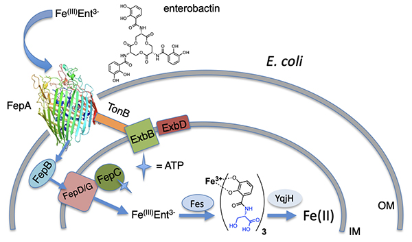 Ester hydrolysis may actually occur in the periplasm in some cases. It is a key component for some bacteria such as Campylobacter jejuni, in which the periplasmic binding protein VueE preferentially binds the Fe(III) complex of the enterobactin fragment with two catechol groups and two LSer, i,e, (DHB-LSer)2 [12].