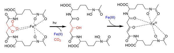 Citrate-containing siderophores. Fe(III)-aerobactin with citrate in the siderophore backbone is also photoreactive (Figure 6) [17], as are the Fe(III)-ochrobactins [24], the Fe(III)-synechobactins [30], and the Fe(III)-petrobactins. In these complexes the reaction is quite clean on UV photolysis into the LMCT band with oxidation of the ligand and reduction of Fe(III) to Fe(II) [31]. The decrease of 46 mass units in the apo-photoproduct reflects loss of CO2 and two H+. The oxidized citryl group in aerobactin produces the corresponding 3-ketoglutaryl derivative, which is in equilibrium with the enoyl derivative used for Fe(III) coordination [31]. We discovered that the affinity of the aerobactin photoproduct is surprisingly high with nearly the same stability constant as for aerobactin [31,32].