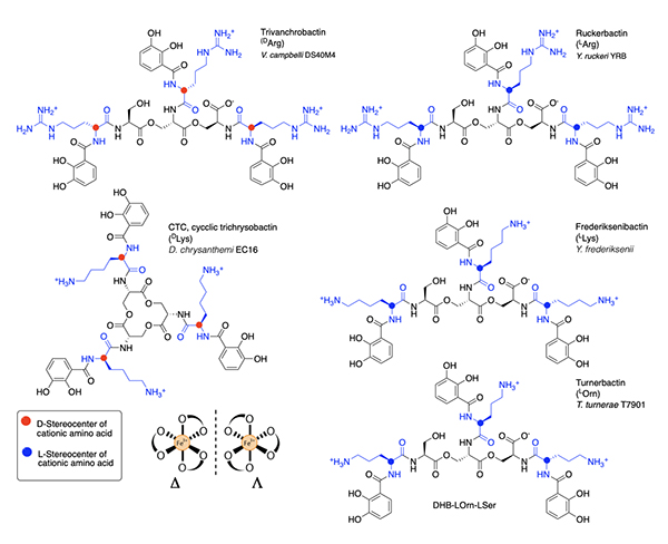 Several related triscatechol siderophores have been isolated from marine bacteria that are distinguished from Ent and BB by the presence of a chiral amino acid inserted between each DHB and the oligo-LSer ester backbone (Figure 7), including the linear tris-LSer scaffolds of trivanchrobactin with DArg (Vibrio campbellii DS40M4) [34], ruckerbactin with LArg (Yersinia ruckerii YRB) [35], and turnerbactin with LOrn (Teredinibacter turnerae T7901) [36]; these bacteria are all marine isolates. The siderophores with LLys and DLys are also known and produced by terrestrial isolates. Cyclic trichrysobactin (CTC) with DLys is produced by the plant pathogen Dickeya chrysanthemi EC16 [37], and frederiksenibactin with LLys is produced by the human pathogen, Y. frederiksenii ATCC 33641) [38]. Trivanchrobactin and ruckerbactin are true diastereomers with DArg and LArg, respectively. Frederiksenibactin with LLys and CTC with DLys are nearly diastereomers, although the former is based on the linear tris-LSer oligoester and the latter is the cyclic tris-LSer macrolactone (Figure 7). The biosynthesis of this suite of D/L cationic amine-containing tris catechol siderophores framed on a tri-LSer oligoester scaffold has been reviewed recently [39], and may well be useful to predicting the full combinatoric suite of this class of siderophores.