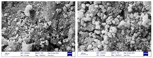 FE-SEM was used to analyze the surface morphology of pure CeO2 nanoparticles that had been calcined at 400°C. The SEM anal- ysis revealed that the prepared sample was formed as spherical aggregates with a reasonably uniform distribution. Figure 2 displays the crystal nature of the equally-sized manufactured nanoparticles.