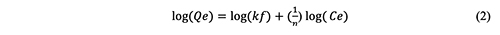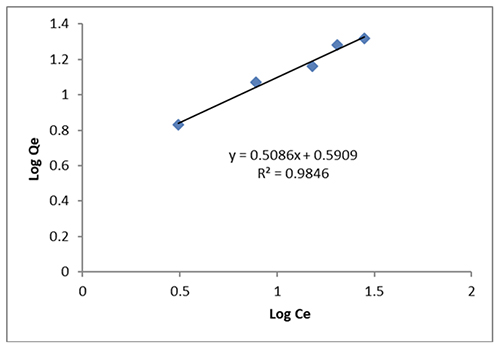 The major purpose of the adsorption analysis is to evaluate the correlation between the dye and adsorption by contrasting the adsorption isotherm with the adsorption data. This study evaluated both the Lang-muir and Freundlich models. The linear Freundlich adsorption process is represented by the following formula [10] [34-36]: