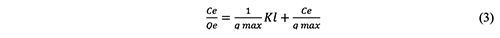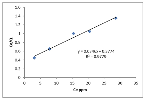 The Freundlich isotherm (R2 = 0.9846) provides a better fit for the adsorption. The equation that follows shows how well the data fits the Langmuir adsorption isotherm [36,37]: