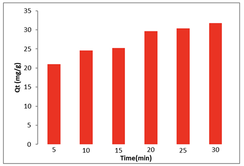 In series of experiments, 0.01 g CeO2 nanoparticle and also 10 ml (50 ppm) dye were used to determine both contact time as well as equilibrium time. The liquid was warmed to 298 K with the use of a 200 rpm shaker. Adsorption happens rather quickly in the first 5 to 40 minutes. Due to the active CeO2 nanoparticles' close association with the dye, quick adsorption is made feasible. After 35 minutes, the dye adsorption rate stabilizes due to the nanoparticles' surface, as seen in Figure 8.