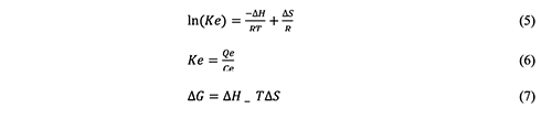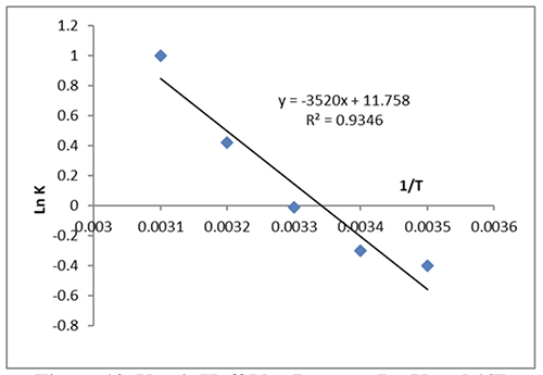 The equilibrium constant, Ke, the gas constant, and the temperature in Kelvin are all equal to 8.314 J/mol K (K). The interaction was endothermic, as shown by the Van 't Hoff plot in Figure 10 between ln K and 1/T, where the ∆H was 29.26 kJ/mole prevented by slope.