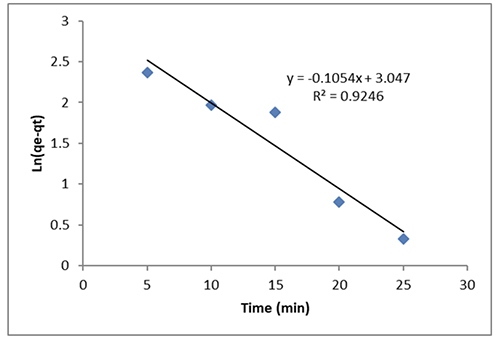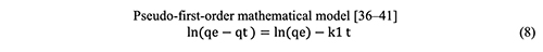 Figure 11 shows the pseudo-first-order rate constant, k1, the equilibrium adsorption capacity, qe (mg g-1), and the amount of dye that has been adsorbed over time, qt (mg g-1) (min-1).