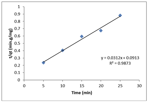 The hypothetical second-order rate constant is denoted by K2. The pseudo-second-order model with a strong association factor (R2 > 0.9873) may adequately capture the kinetic information, as shown in Figure 12.
